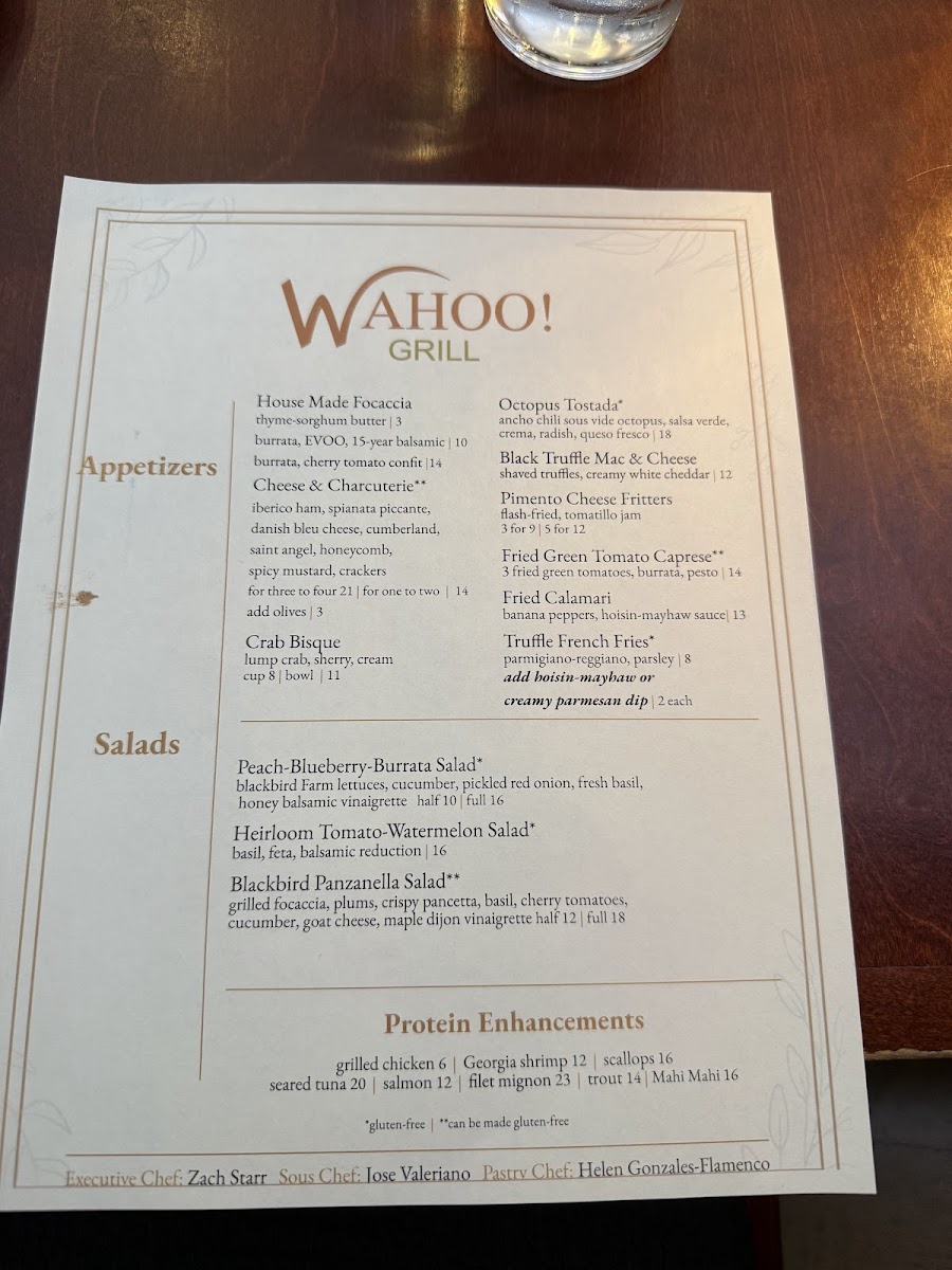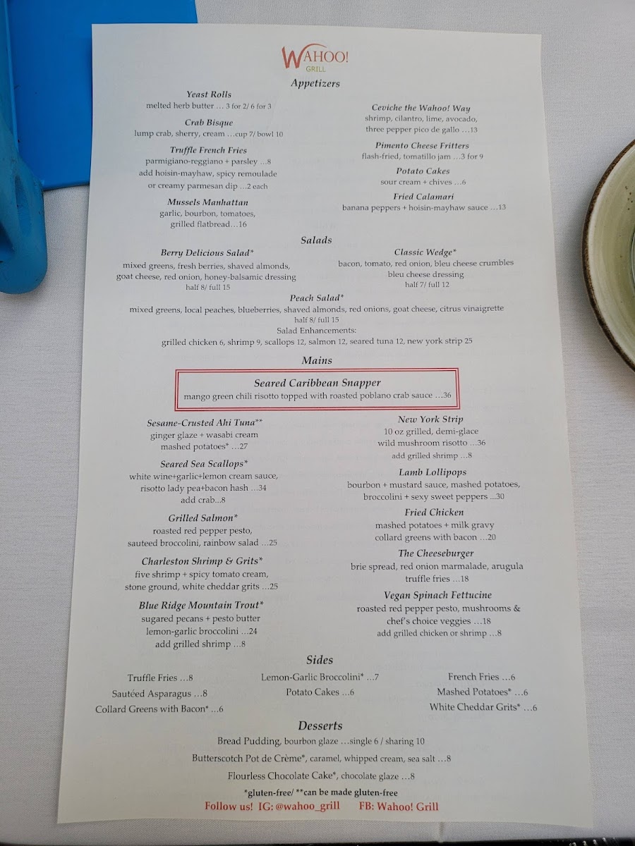 At Wahoo! Grill, you'll find a delightful mix of Southern and contemporary cuisine that will tantalize your taste buds. Start your dining experience with their infamous Fried Green Tomatoes or the exquisitely prepared Calamari Flashfried, served with a zesty banana peppers hoisinmayhaw sauce. For something truly special, don’t miss the Charcuterie Board, featuring a curated selection of iberico ham, creamy Danish blue cheese, and fresh honeycomb that will make your palate dance.